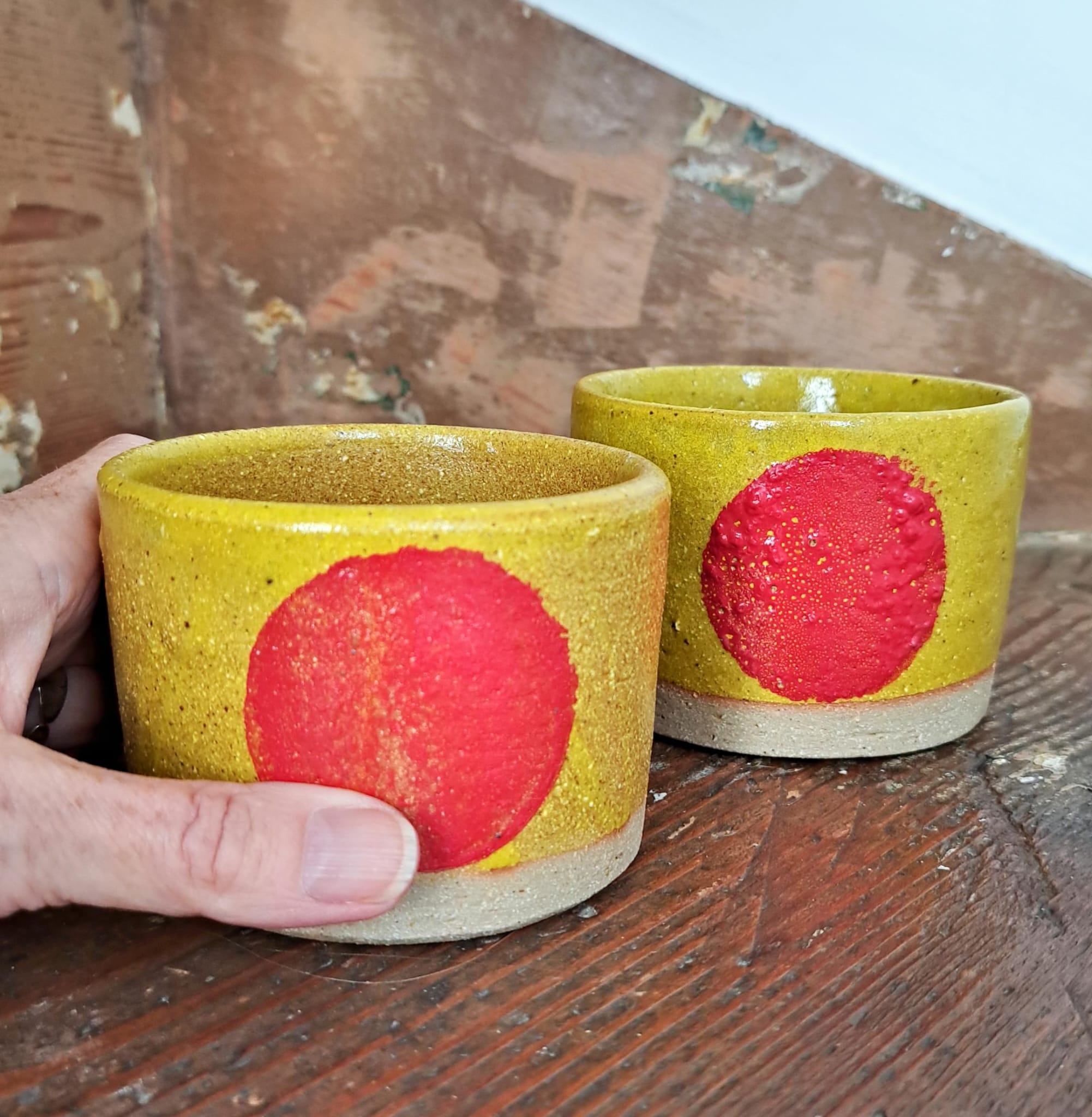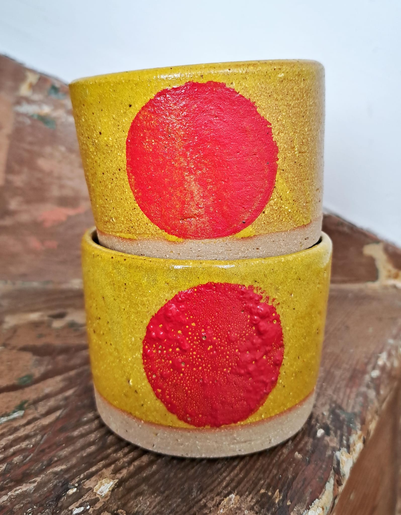 Striking, handless mugs in colours inspired by my trip to India. Hand-thrown with iron-rich clay to give each piece its unique, organic look and feel, and decorated in a marigold glaze with cherry red ‘dot’. Use for coffee, tea, or even as small nut bowls for a funky addition to your kitchen.