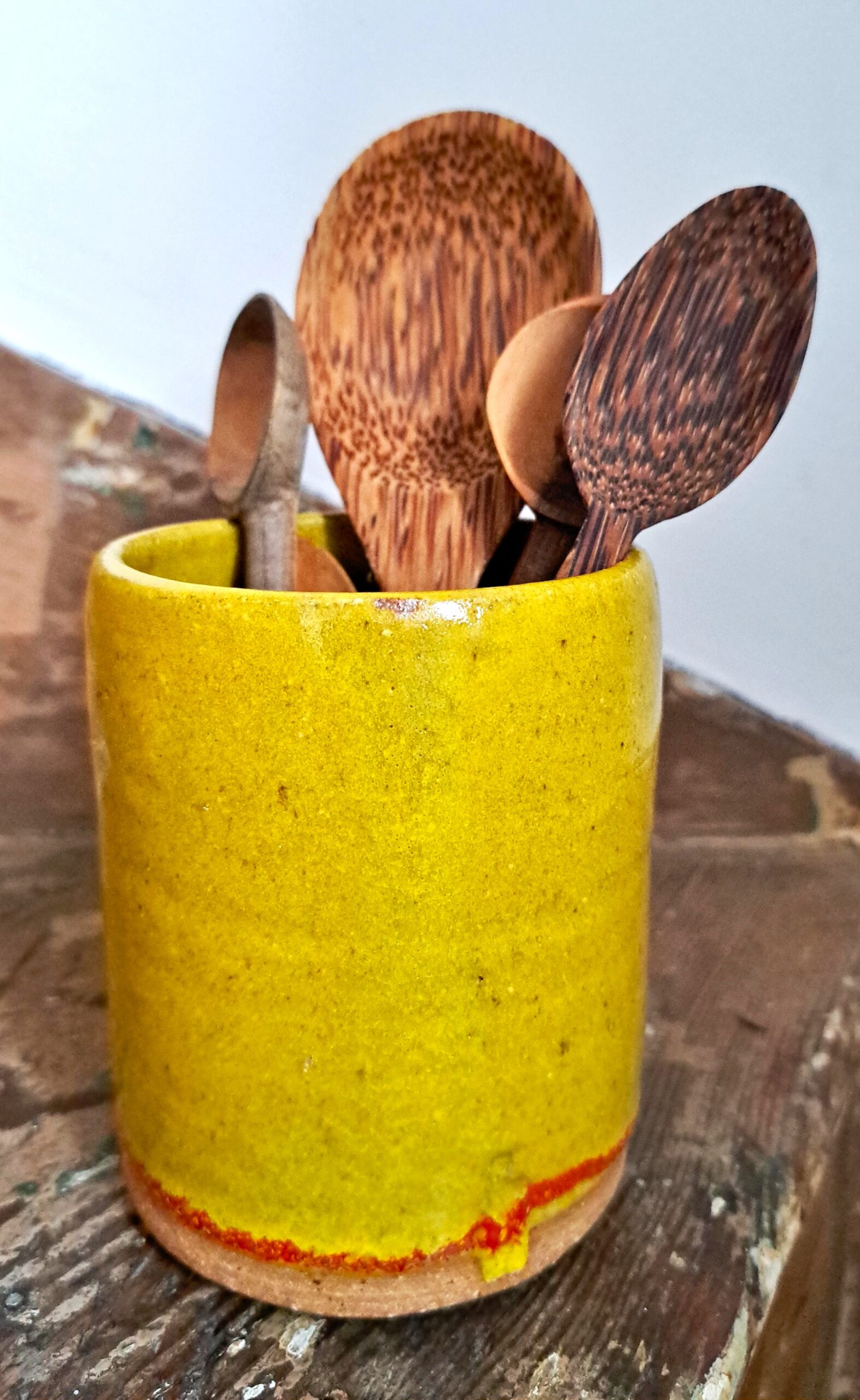 Narrow pot in a striking marigold glaze and banded with cherry red pigment, inspired by my trip to India. Hand-thrown with iron-rich clay to give it its unique, organic look and feel. Use for storing small kitchen utensils, such as wooden spoons, or as a funky addition to your office desk/studio to hold pens or paintbrushes.