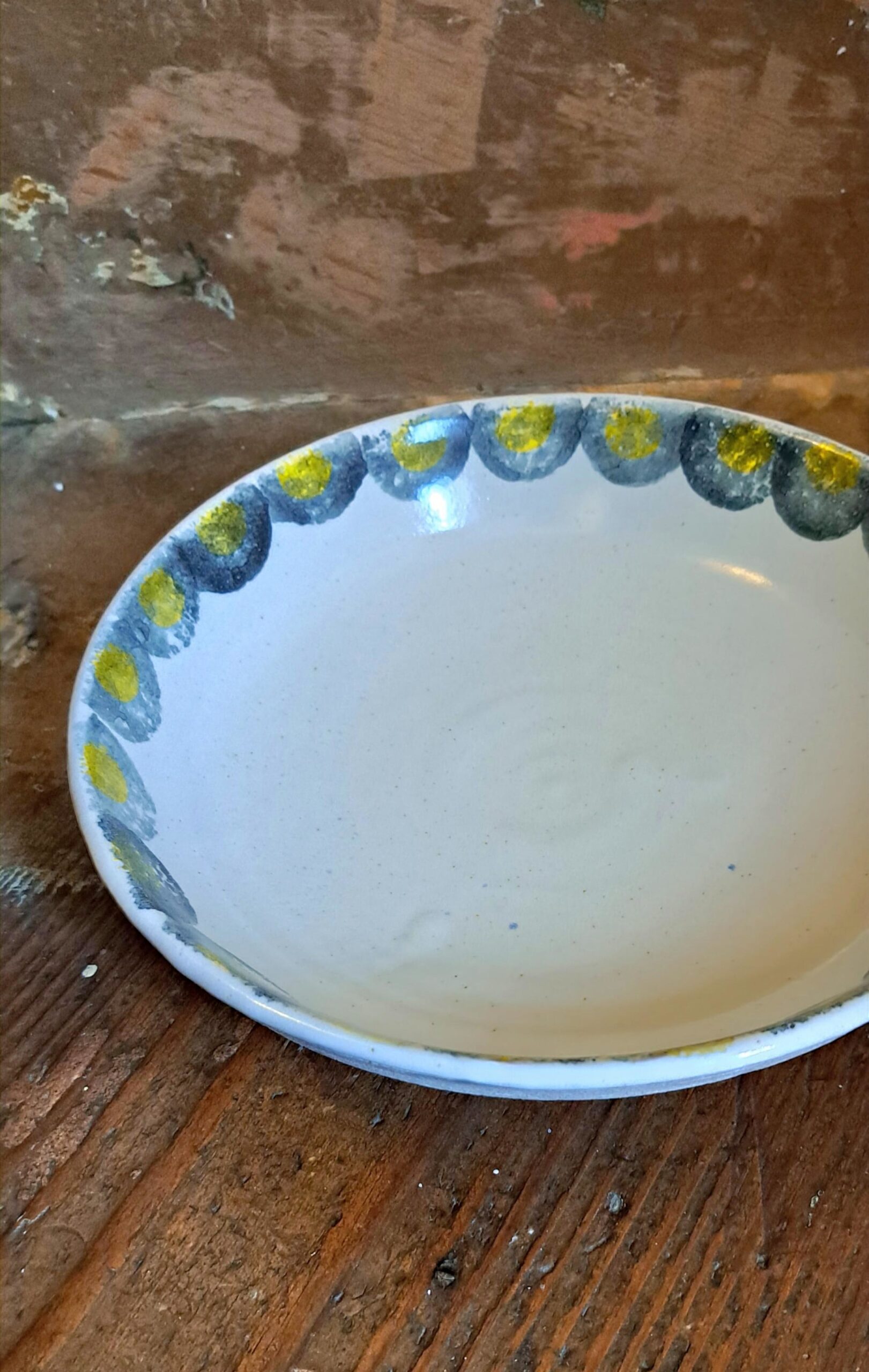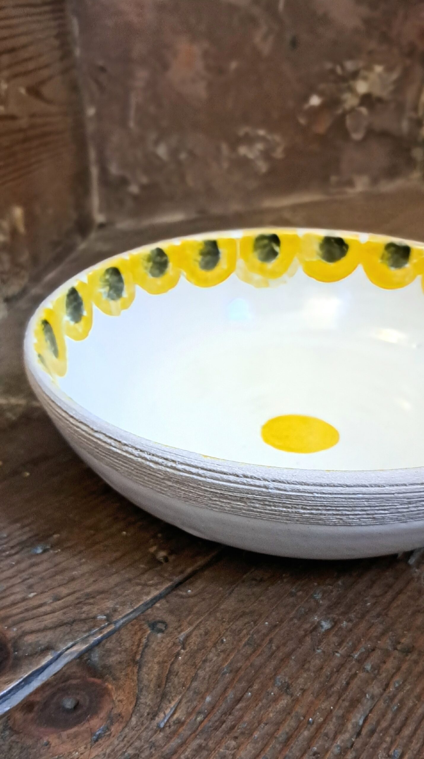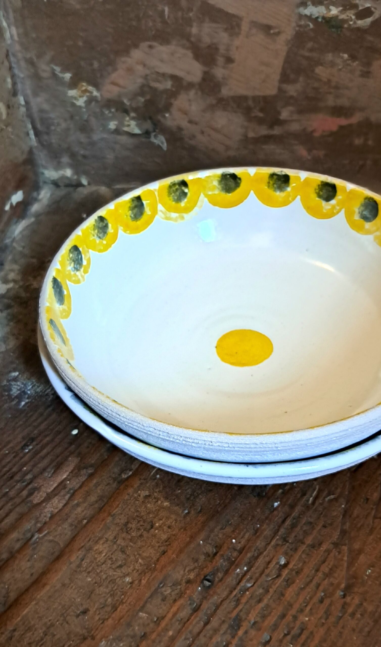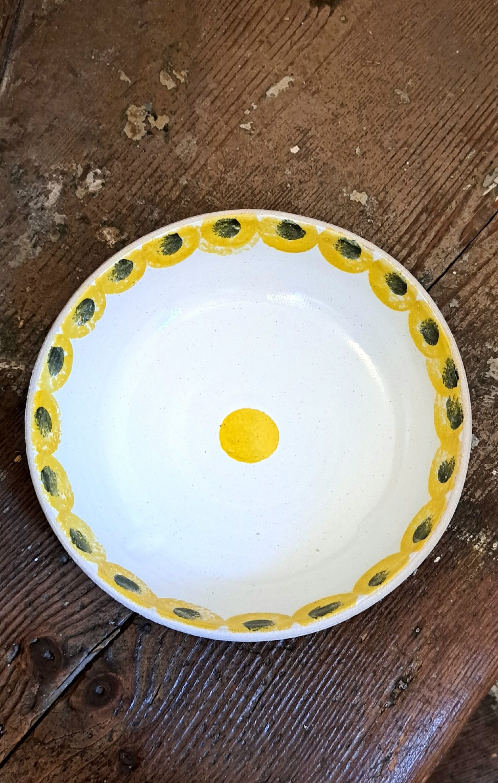 These pretty, sponge-decorated bowls are perfect for pasta or a hearty soup. In white stoneware and yellow/black pigment, they are microwave, oven and dishwasher proof.