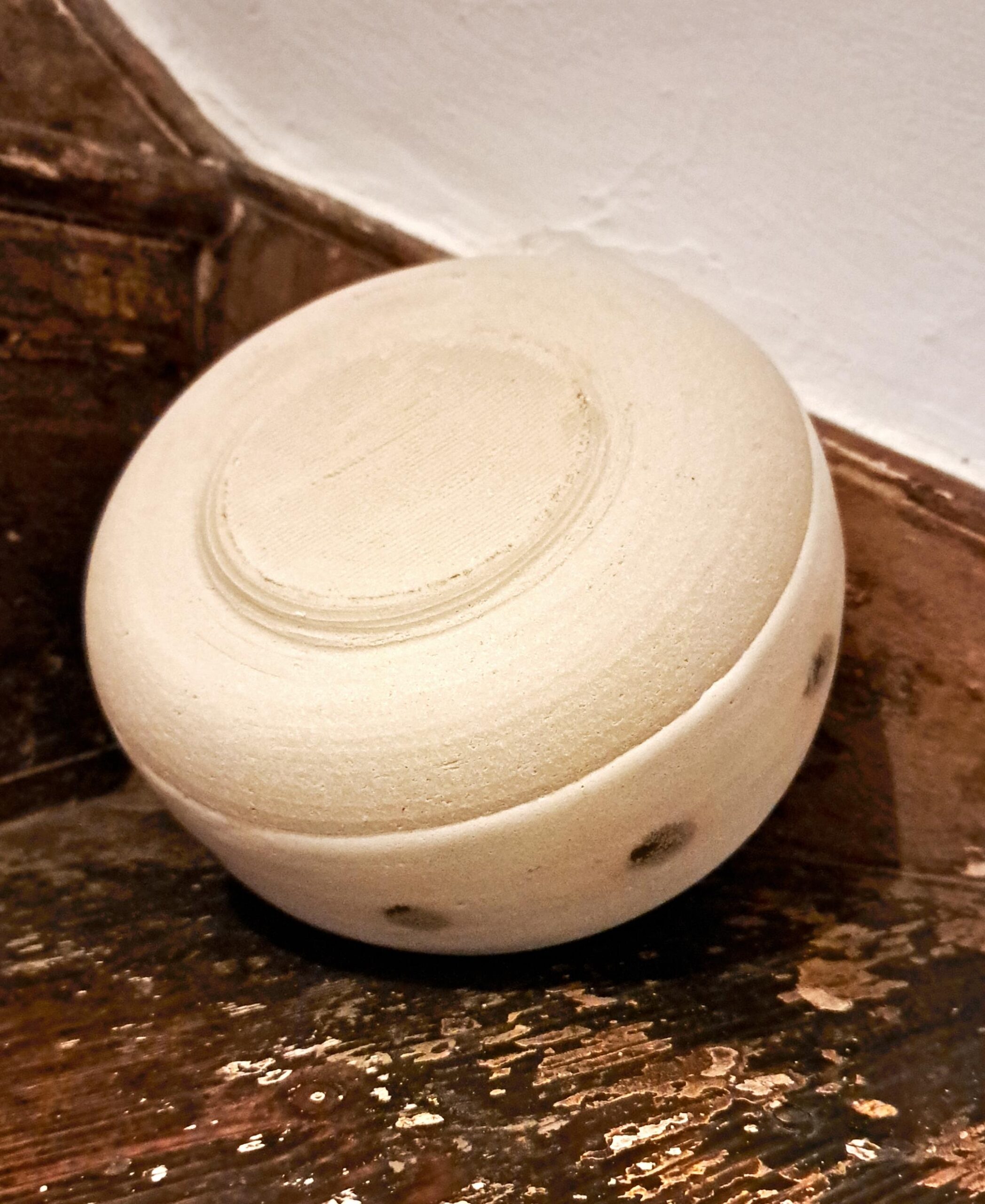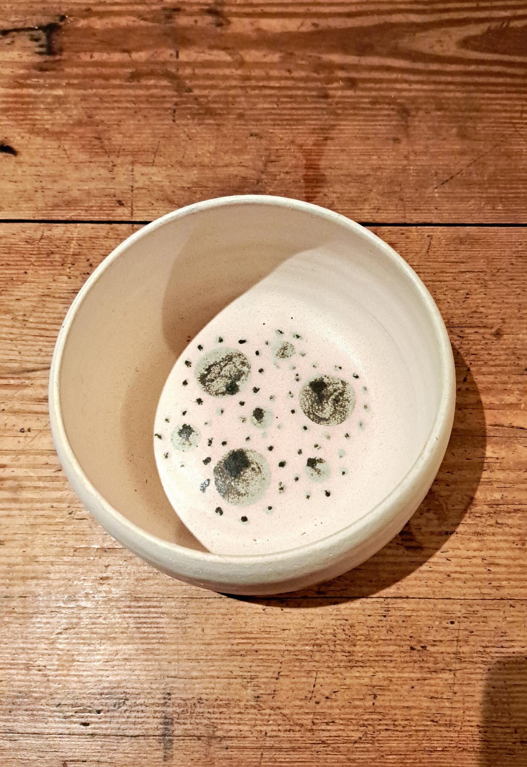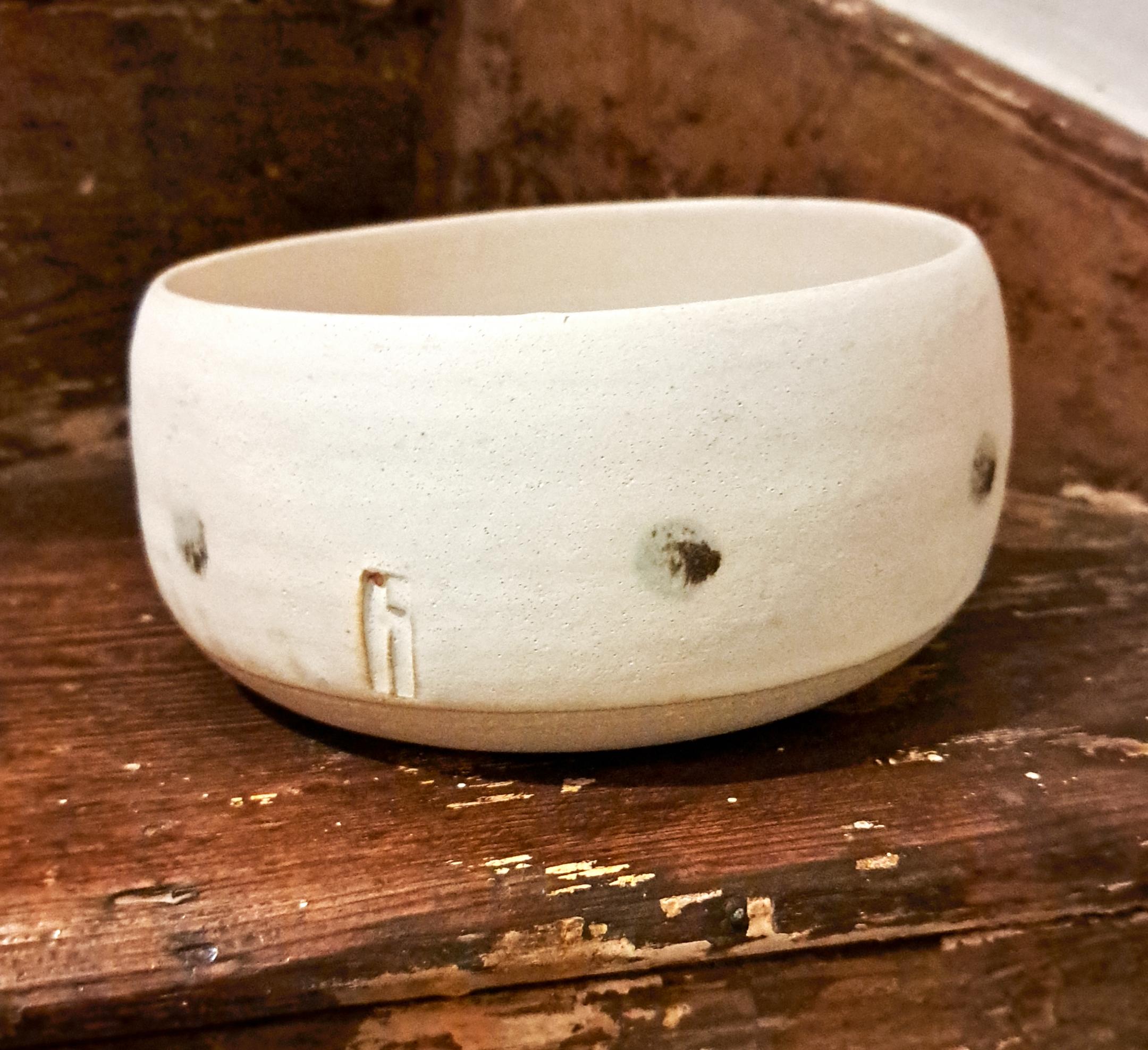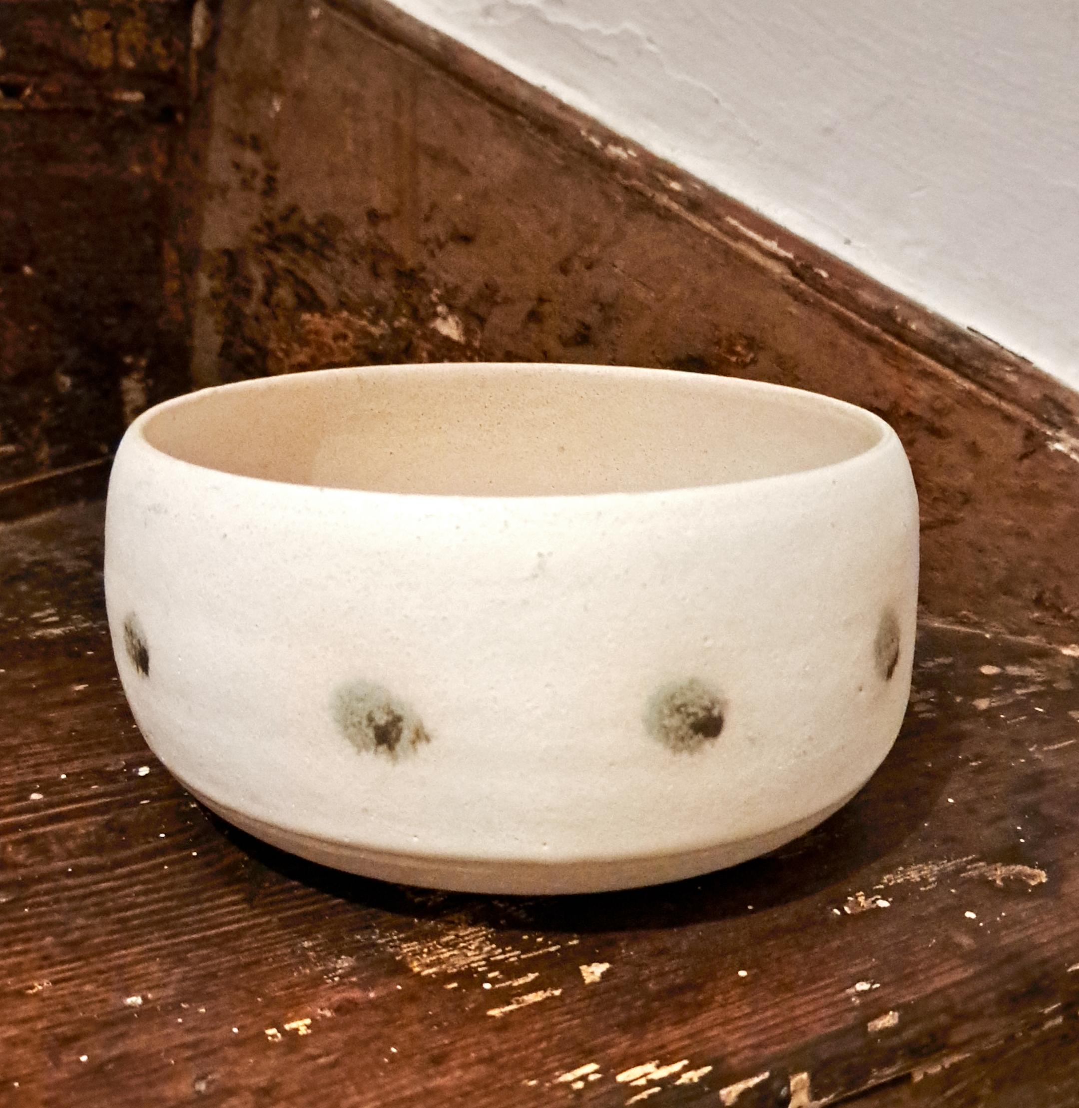 A pretty, white and blue-grey spotted bowl perfect for soup, pasta, noodles or as a receptacle for holding eggs or tomatoes on the kitchen table, or even snacks at a party! White stoneware in a tactile, white glaze, it is dishwasher, microwave and oven safe.